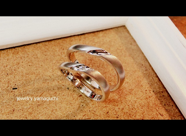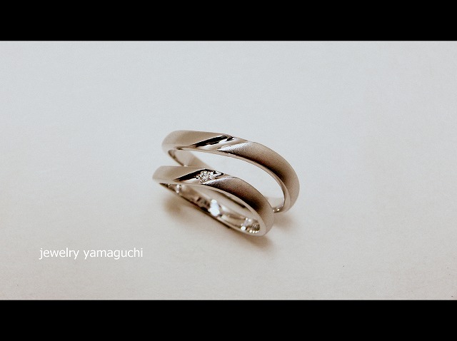ベースのデザインはV字で、若干男性用はカーブが緩くなっています。表面の形状は左右非対称に削り出しました。女性用にはメレダイヤを5p彫り留めし、男性用には同じ場所をつや消し処理を施しました。