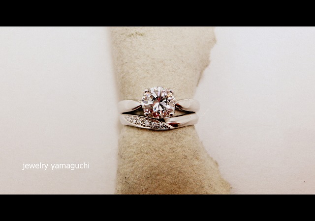 一つ前の記事の結婚指輪とセットで作らせていただきましたが、画像のように重ね着けができるようになっています。二本を組み合わせることにより、ボリューム感に加え繊細さもでてゴージャスさUP!