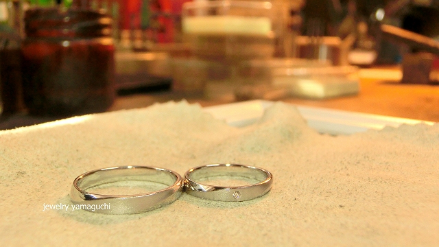 指輪のベースはストレートラインですが、丁寧なヤスリがけにより表面にデザインを入れることにより捻じれた立体感のある印象に仕上がっています。男性用・女性用ともに同デザインですが、女性用にはダイヤを1p セットしました。リング幅は若干男性用が太くなっています