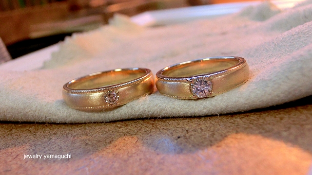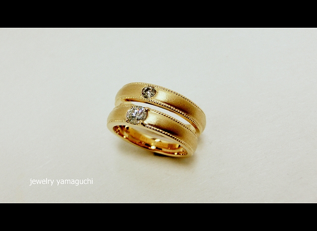 両サイドにはミル打ち加工をし、表面はつや消し仕上げを施しました。ゴージャスでカジュアルな、個性的な結婚指輪ができました。