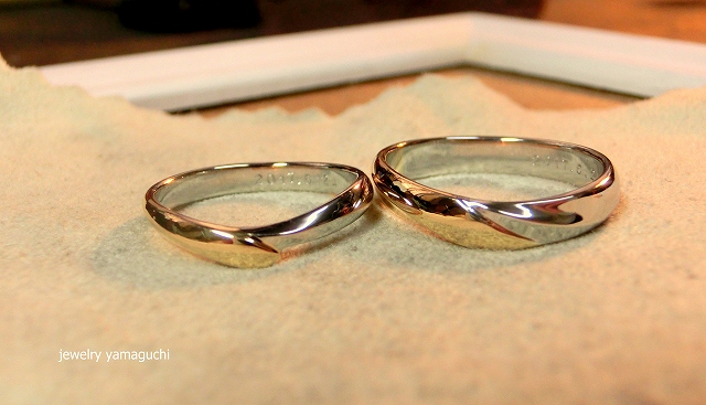 男性用・女性用ともに基本的には同じデザインですが、男性用のほうが太めの幅になっています。K18、Pt900のコンビですが、アフターケアを考慮して K18は一部分しか使用していませんのでサイズ直し可能です。思いのこもった素敵な指輪ができました!