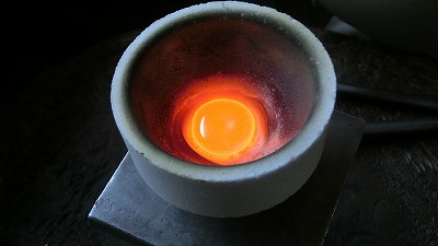 ・製作に必要な分のプラチナの地金を溶解します。すべて指輪はこの塊から作っていきます。