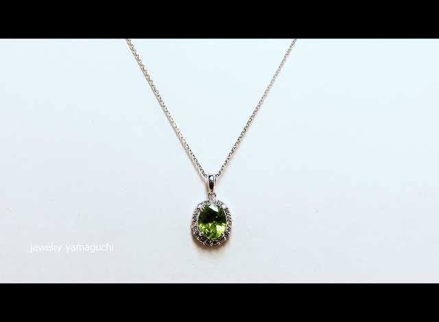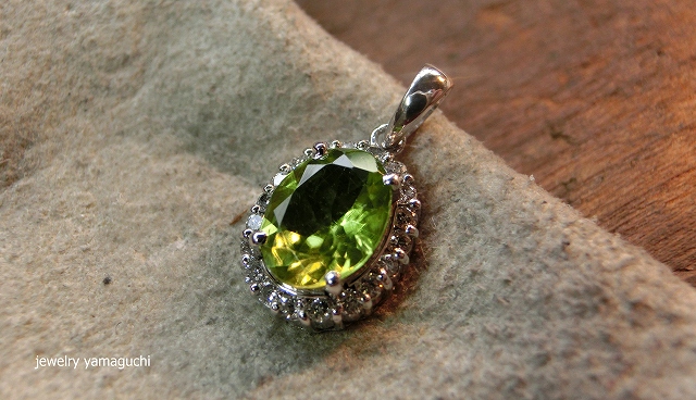 オーバルカットのペリドットにメレダイヤを取り巻いたデザインで製作。ダイヤもお客様お持込の物を使用しました。