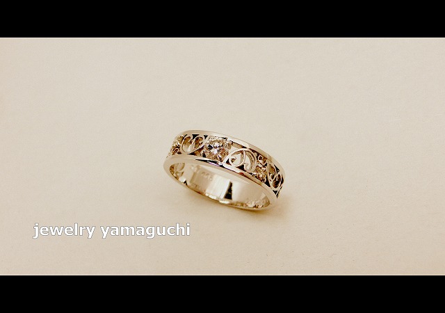 やや幅広めの平打ちのリングをベースに透かしで唐草模様をいれました。
